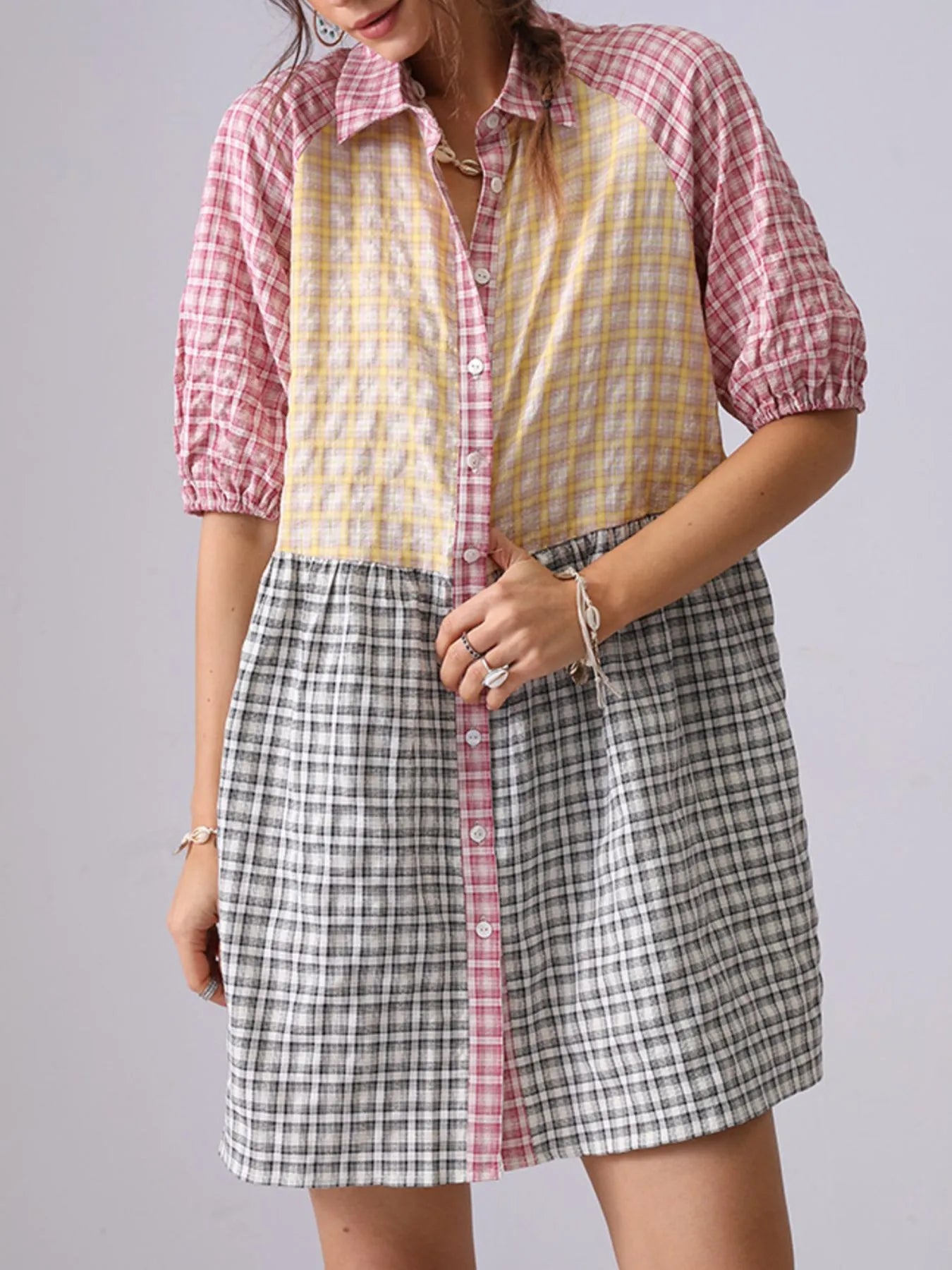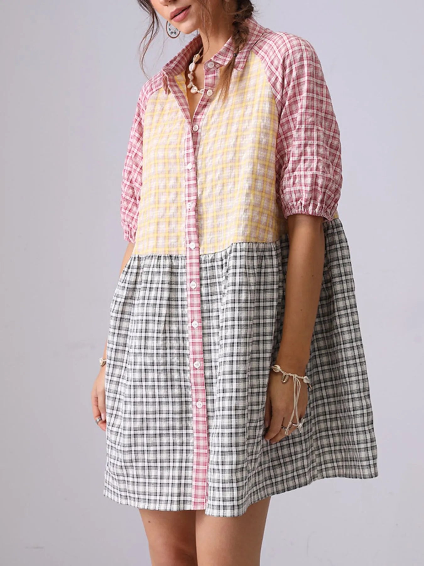 Colorful Mixed Gingham Shirt Dress